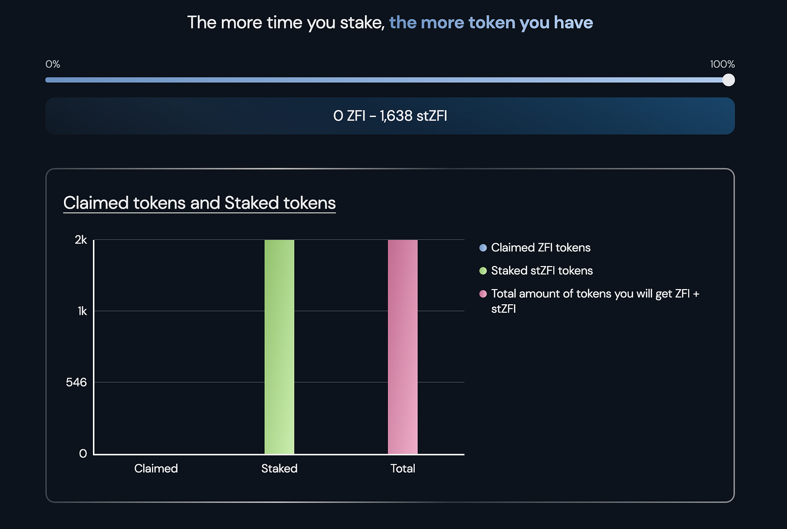 For example, if you receive 819 ZFI tokens in the Airdrop, you could stake them to get 1638 stZFI. When you decide to unstake, an unvesting period of 6 months will apply.