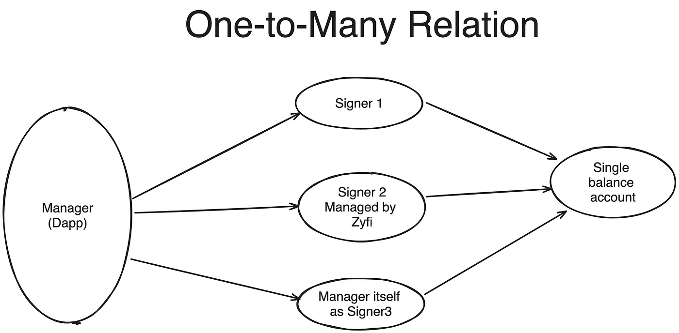 The depositor address of the Dapp is the 'Manager' and the added signer address is the trusted 'Signer' whose signature will be verified for sponsorship in the paymaster to use the manager’s gas funds for the user.